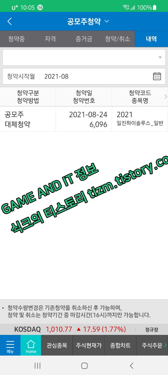 STEP4. 아래 이미지 맨 아래에 청약을 눌러주세요. 10시되자마자 해서 그런지 아직 총 경쟁률은 나오지 않았네요. 자세히 알아본건 아니지만, 방열기 금속탱크등이 주력인거 같습니다. 좀 더 알아봐야 하겠지만, 원전주는 혹시 아닌지 확인할 필요는 있어보이네요. 원전주면 좋을거 같긴 합니다.