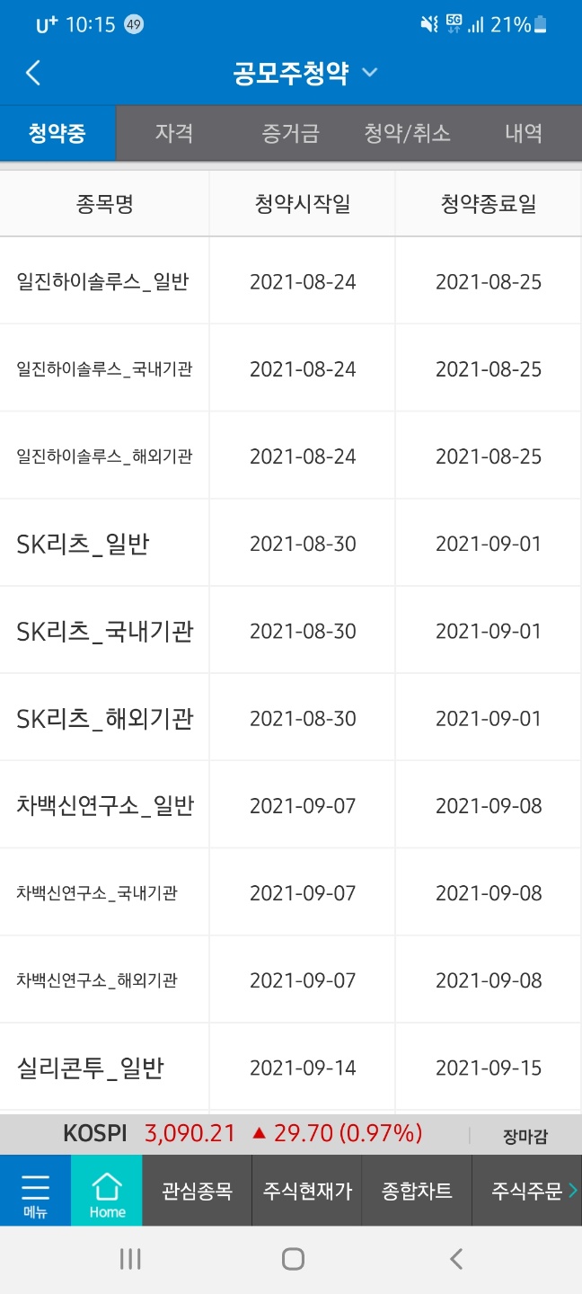 STEP3. 그럼 이렇게 공모주와 함께 청약시작일 청약종료일이 함께 나옵니다. 해당날짜를 보시고 따로 알람을 거셔서 그날 하시면 되는데요, 저는 일진하이솔루스_일반을 해보겠습니다.