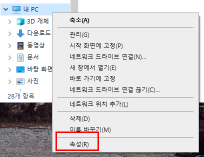 여기서 제가 빨간네모로 표시한 속성을 눌러 주시면 됩니다. 단축키(R)이라고 적힌 속성을 클릭하시면 아래와 같이, 현재 내가 쓰는 컴퓨터 운영체제 와 컴퓨터 사양에 대한 창이 뜨는데요.
