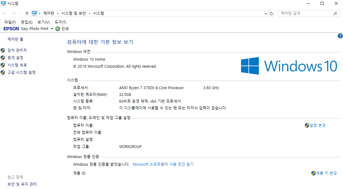이 창에서 Windows 버전에 Windows 10 Home 이라는게 보이시죠? 이게 내가 쓰는 컴퓨터 운영체제 입니다. 그 밑으로는 시스템은 제가 쓰는 컴퓨터 사양이구요. 프로세서(CPU)는 라이젠 7 3700X 8core 에 3,60 GHZ 이구요. 제가 멀티태스킹을 많이 해서 램은 32GB나 설치 했습니다. 구매할 당시 상당히 좋은 수준의 컴퓨터로 구매했습니다.