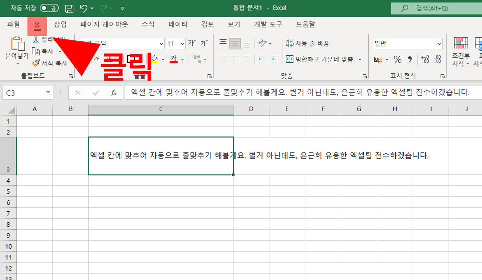 C3의 행에서 작성한 한줄의 길게 늘어선 글을 보고 있자면 여간 불편한게 아닙니다. ALT + ENTER로 조정가능하지만, 이번에는 자동으로 줄을 바꾸게 하고 싶습니다. 가장 먼저 엑셀 자동줄바꾸기를 위해 상단에 파일 옆 < 홈 > 버튼을 클릭해주셔야 합니다. 보통은 엑셀을 키시고 문서작업을 하시면 아래와 같이 화면이 떠서 따로 홈버튼을 클릭해 줄 필요가 없기는 합니다.