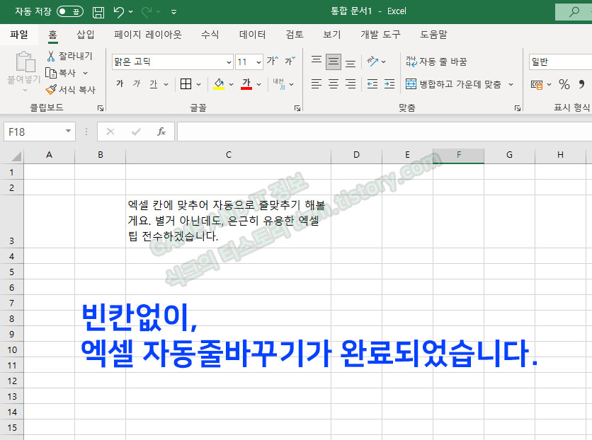 EXCEL 자동줄바꾸기 (홈> 자동줄바꿈)
