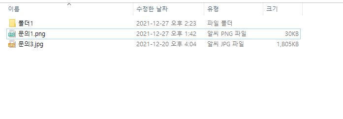 그럼 아래와 같이 문의 2.png 라는 파일은 숨기기 하였기 때문에 해당파일은 보이지 않습니다. 그럼 숨긴 파일을 다시 보려면 어떻게 해야 할까요?