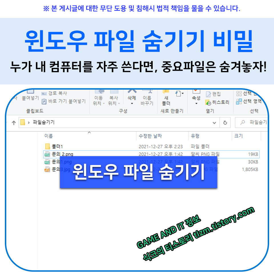 윈도우 파일숨기기 해보겠습니다. 집안에 있는 컴퓨터나 회사에서 사용하는 나만의 컴퓨터가 있지만 종종 가족이나 회사내 동료가 제 컴퓨터를 사용해야만 하는 순간이 있습니다. 그런데 나만 보기를 원했던 파일이 있는데, 그걸 누군가 보게 된다면, 당황스러운건 둘째치더라도, 싫기도 싫은데요, 그래서 윈도우 파일숨기기 해보고자 합니다.