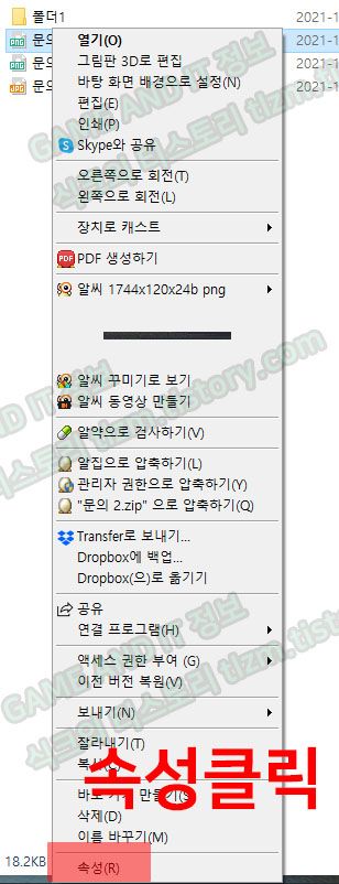 윈도우파일을 숨기기 위해서 가장 먼저 숨길 파일에 마우스를 갖다대고 오른쪽마우스 버튼을 클릭해주세요. 그럼 아래와 같이 속성이 보일텐데요, 속성을 클릭해주세요.