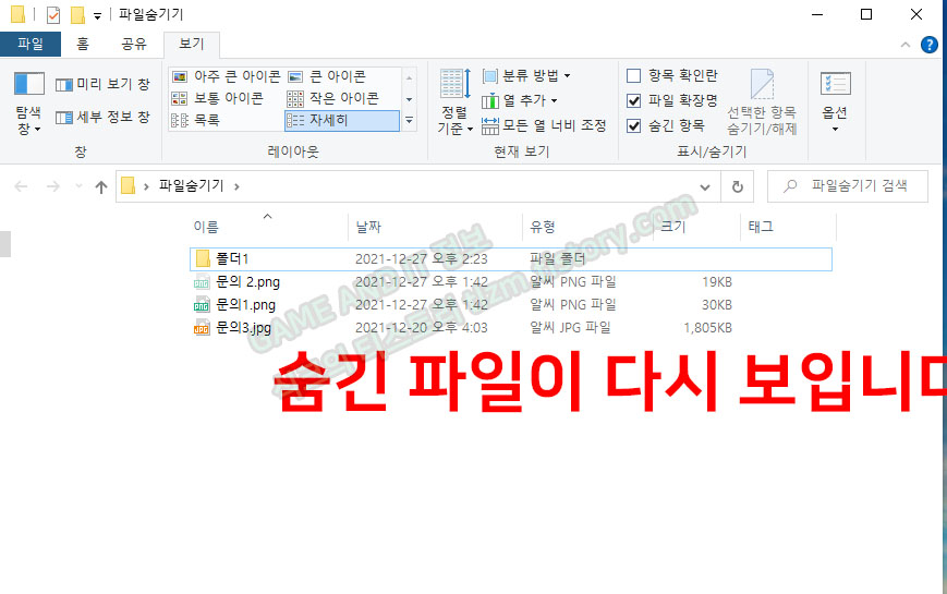 다시 원래 폴더로 돌아가서 확인을 해보니 숨겨놓았던 "문의 2.png" 파일이 다시 보입니다. 간단하죠?