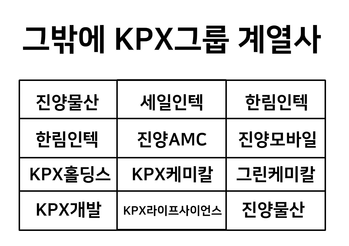 그밖에도 다양한 상장된 '진양'계열사들이 많은데, 본체인 KPX그룹 산하 업체들을 살펴 보시면 됩니다. KPX그룹은 29개나 되는 계열사가 있습니다. 진양산업, 진양화학, 진양폴리, 한림인텍, 세일인텍, 진양모바일, 진양AMC, 진양물산 모두 진양홀딩스 산하에 있는 계열사 들입니다.
