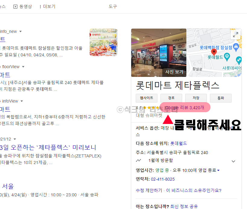 우선 저는 제가 다녀온 롯데마트 잠실점에 대한 후기를 남기고자 Google 사이트에서 "롯데마트 잠실점"을 검색하였습니다. 여담으로는 롯데마트 잠실점에 위치한 제타플렉스(ZETTA PLEX)가 없는게 없는 전자제품의 체험공간이자, 구매를 할 수 있다기에 찾게 되었습니다.