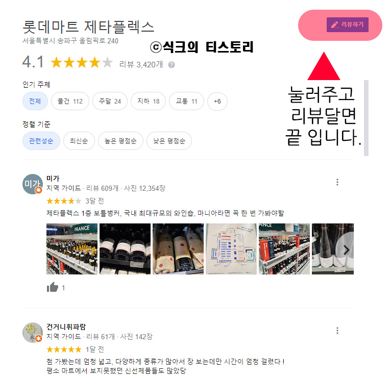 아래와 같이 리뷰하기 버튼을 눌러주세요. 그리고 이왕이면 느끼신대로 써주시면 좋을 거 같아요. 제 개인적인 롯데마트 제타플렉스 구글리뷰 후기는 아주 좋았다 입니다. 생각보다 다양하고, 없을법한 제품들도 있었어요. 최신스마트폰들부터 애플 등등 모두 직접 볼 수 있고 만져 볼 수도 있었습니다. 오랜만의 티스토리 포스팅 끄읕~