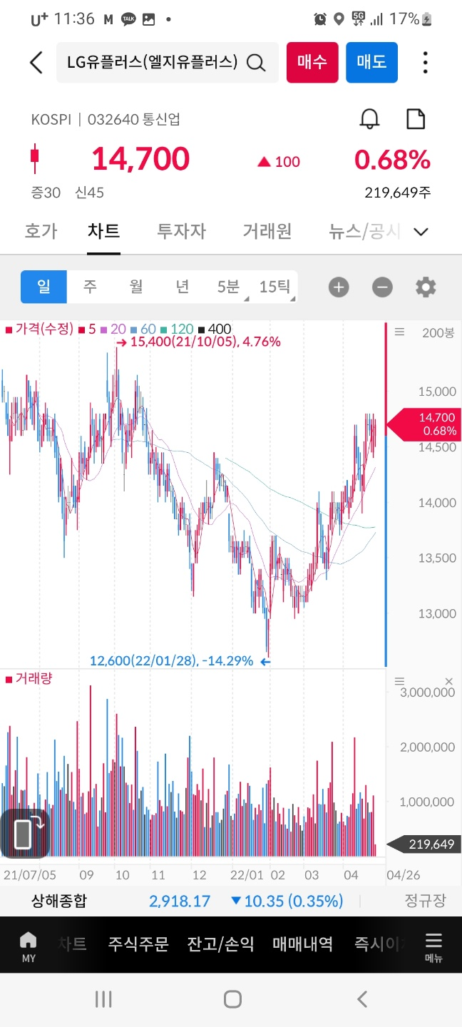 이번정부에서 LG가 조금 수혜(?)를 본것으로 알려지는데, 그런것도 있지만, LG유플에서 디즈니플러스 서비스한다는 소식에 멍청하게도 고점에 들어갔습니다. 본의아니게 배당금만 쭉쭉타먹고 있습니다. 기관에서 목표가는 20,000원인데, 제 의견은 잘가야 15000원일거같다는 생각입니다. 주포형님들이 보시고 한번 올려주셨음 하는 바램입니다. 현재까지 수익률은 -7%대. 손해는 나면 안되니, 앞으로 1년뒤에 팔면 배당금까지 계산하면 손해는 아닌 본전.