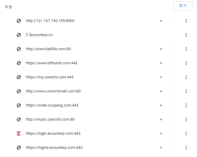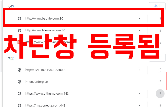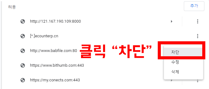 차단을 추가 하려고 하는데, 저도 모르는 사이에 허용된게 엄청 많습니다 ㄷㄷㄷㄷ 어떤 건 들어가 본적도 없는건대 말이죠. 그래서 차단해보겠습니다! 다시 밑에 설명으로!