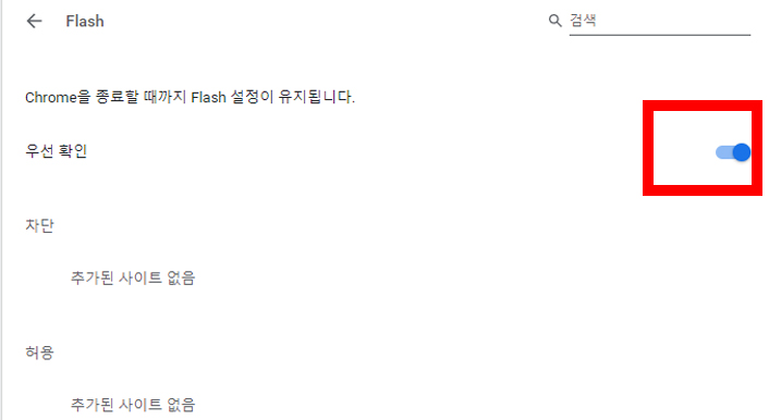 Flash 창 입니다. 여기서 게이지바를 클릭하시면 오른쪽과 같이 파란색이 됩니다. 즉, 크롬 팝업 차단 쉽게 하는 방법 완성이 된것이지요. 마찬가지로 뒤로 가기 버튼을 누르고 팝업 및 리디렉션 허용을 하겠습니다.