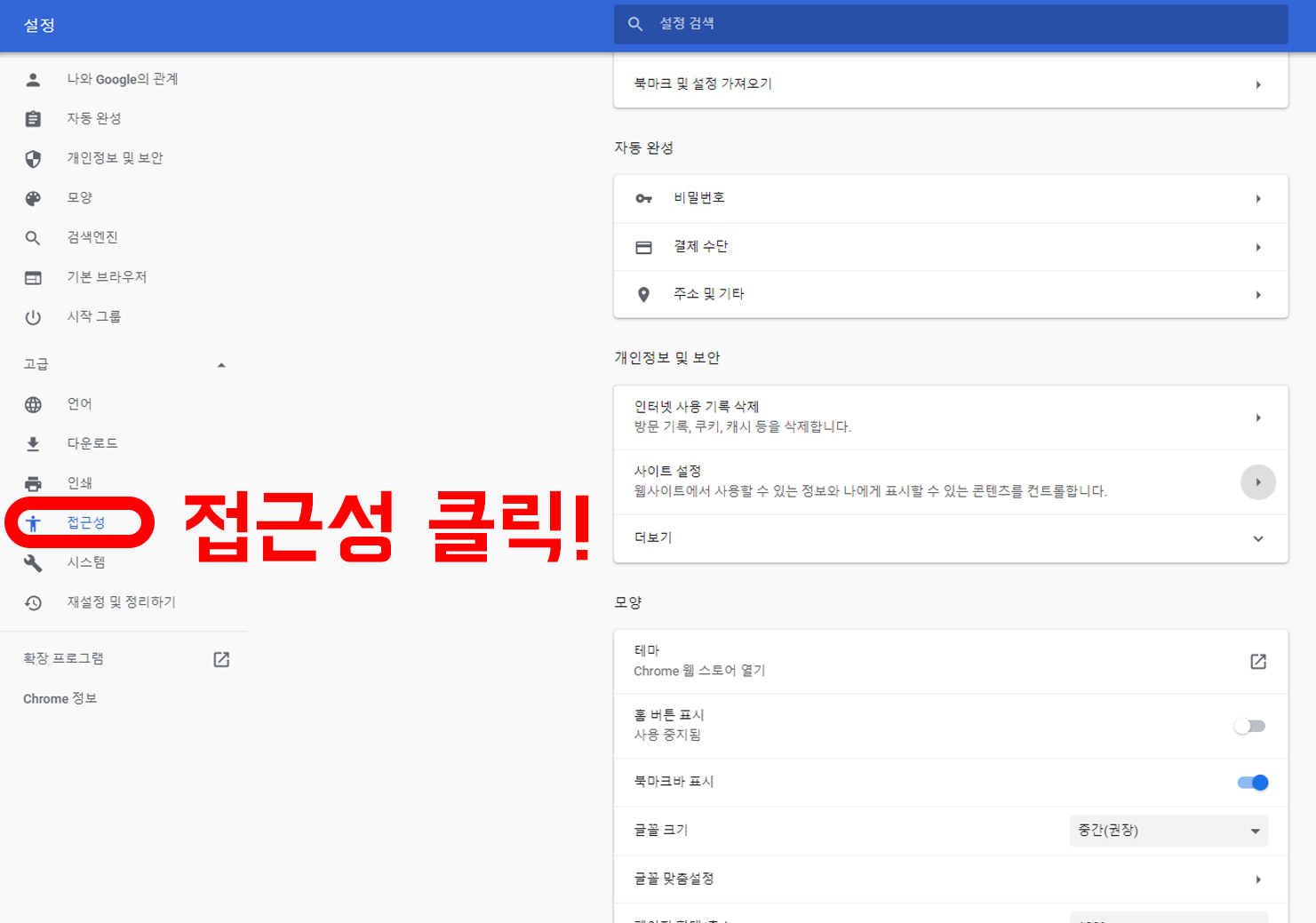 접근성을 마우스 왼쪽 버튼으로 클릭 하시고 나면, 화면 중앙의 카테고리에 나와 Google의 관계, 자동완성, 그리고 세번째 개인정보 및 보안 카테고리가 있는데요, 여기서 사이트 설정 원클릭 해주세요.