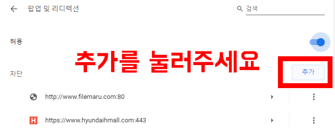 차단하실 팝업사이트가 있다면 아래사진과 같이 추가버튼을 눌러주세요.