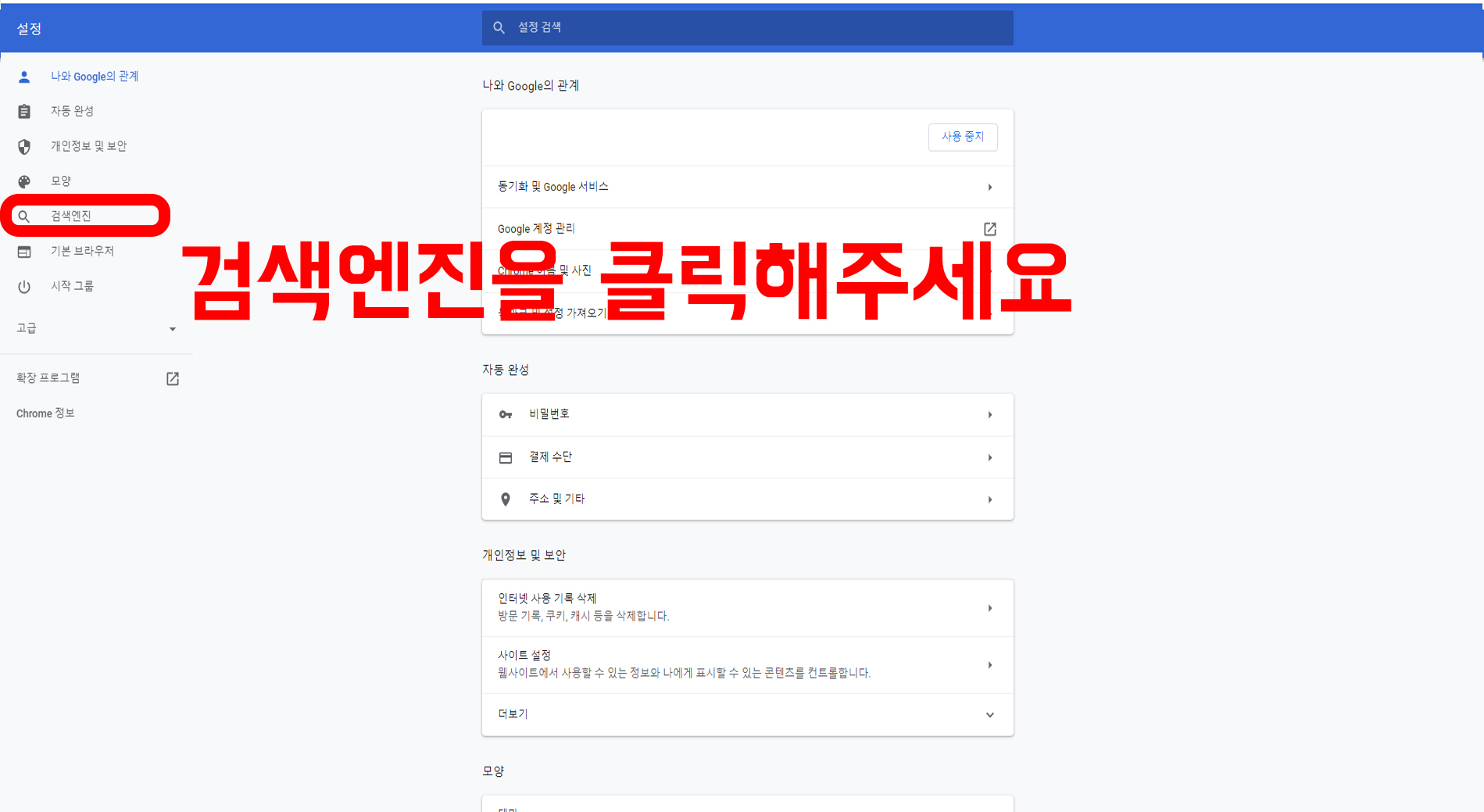 여기서 게스트로 접속하시면 저의 경우에는 이런창이 안뜨는데요, 만약 구글 아이디가 있으면 크롬에 연동하실 수 있습니다. 저는 설명을 위해 제 크롬 아이디 연결해서 하는 거에요. 사진과 같이 여기서 사진과 같이 검색엔진 클릭 을 해주시면 되겠습니다.