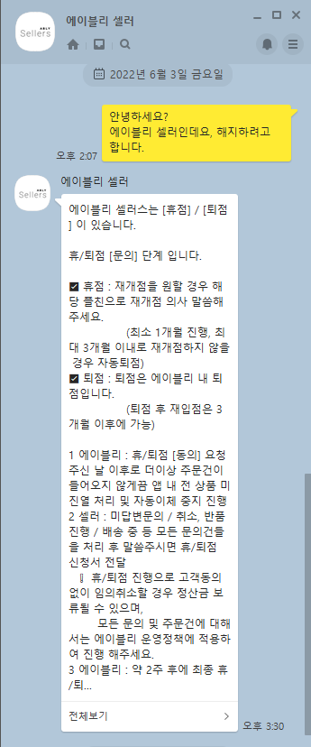 STEP2. 해지하려고 한다고 하고 문의를 하면 아래와 같이 답변을 해줍니다.