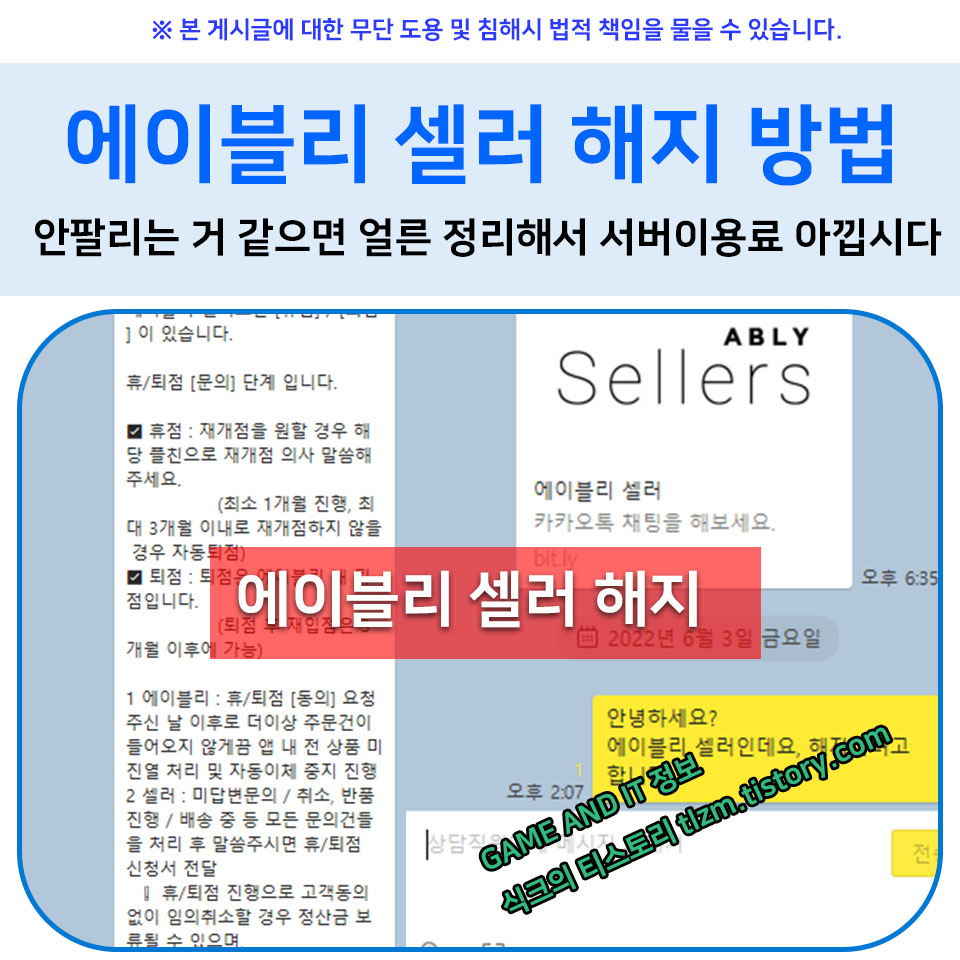 야심차게 에이블리에서 잘팔아보고자 했으나, 생각보다 경쟁이 너무 치열합니다. 가격경쟁도 너무 치열하고 남는게 남는게 아니더라구요. 그래도 좋은 물건으로 팔아보고자 했으나, 일단 저렴한 상품들위주로 매출이 오르는걸 보고, 아무래도 저희랑은 맞지 않아, 해지하기로 마음먹고 해지하는데, 생각보다 절차가 있어서 에이블리 셀러 해지 방법 알려드리고자 합니다.