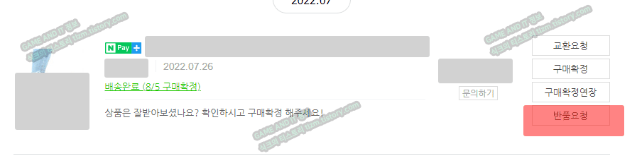 STEP4. 반품요청을 클릭해주세요. 교환요청 또는 판매자를 위한 구매확정을 눌러주시거나, 고민을 위해 구매확정연장을 누르셔도 되는데요, 우리는 오늘 스토어팜 반품 방법을 알아보기 위함임으로 반품요청을 눌러주시면 되겠습니다.