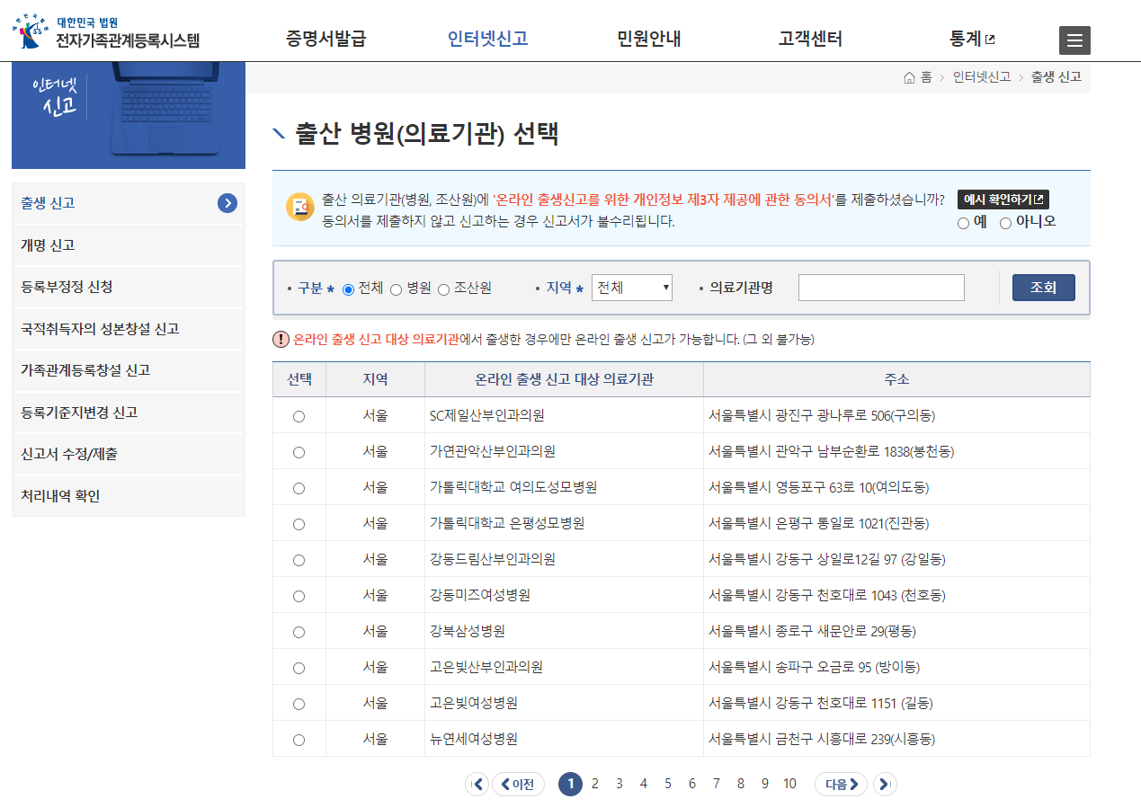 STEP4. 그럼 아래와 같이 어느 산부인과에서 태어났는지 물어봅니다. 지역설정>의료기관명을 입력해서 찾아주세요.