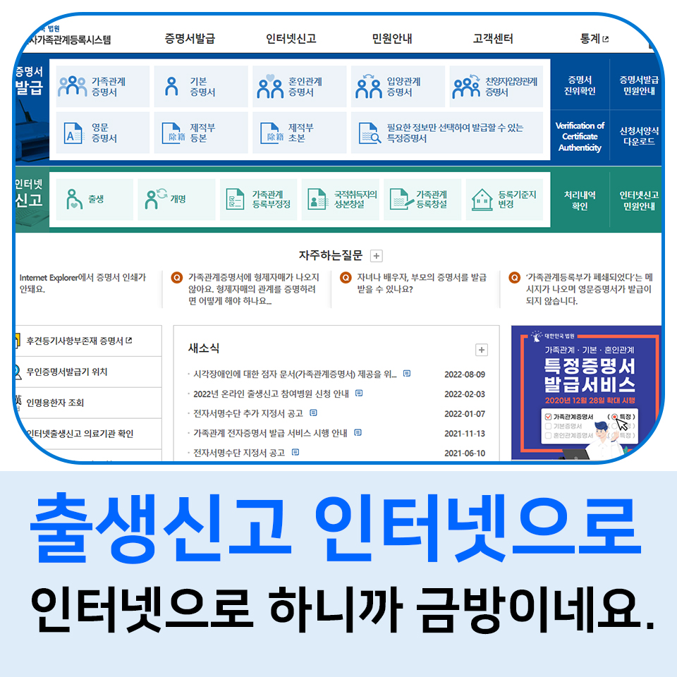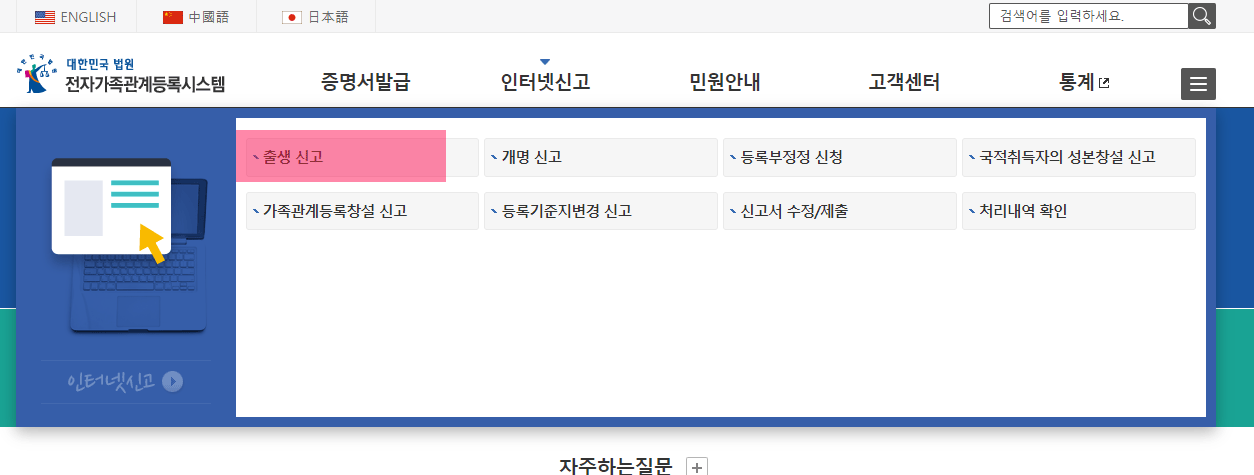 우선 대한민국 법원 전자가족관등록시스템에 접속하셔야 합니다. 직접 동사무소 찾아가서 하시는 방법도 있지만, 인터넷으로 하는게 빨라서 저는 출생신고 인터넷으로 등록하기로 하였습니다.