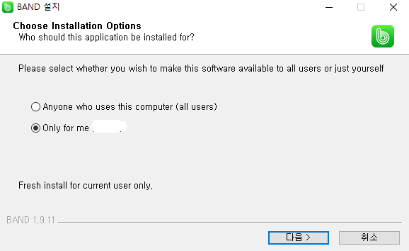 첫번째는 네이버 밴드 PC버젼 다운로드 한 사람 모두가 이용이고, 두번째는 네이버아이디로만 적용되는 건데요. 다음> 을 누르시면 그다음 설치폴더를 정합니다. 설치폴더를 정하여 다운 하고 나면, 이제 완료 인데요.