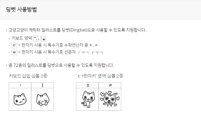 고양시 전용서체인 고양체는 다른 폰트와 달리 남다른 매력이 있어요. 딩뱃이라고 해서 캐릭터 일러스트를 쓸수 있는데요. 사용방법은 사진 참고해주세요.