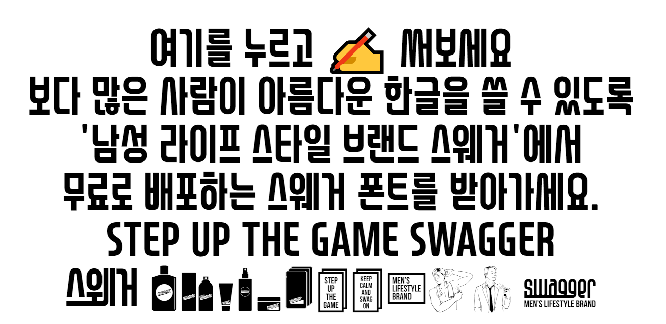 스웨거 라는 회사에 대해선 저는 생소한대요. 이렇게 매력적인 상업용으로 사용해도 되는 무료폰트를 찾다가 만났습니다. 한글날을 맞이해서 산돌폰트와 함께 만들었다고 하는데요. 참, 스웨거는 남자 왁스를 포함해 남자 라이프 스타일에 대한 제품을 판매하는 곳이에요. 스웨거폰트를 사용하시면서 기부를 하시면 백혈병 환자들을 위한 지원금으로 간다고 하네요.