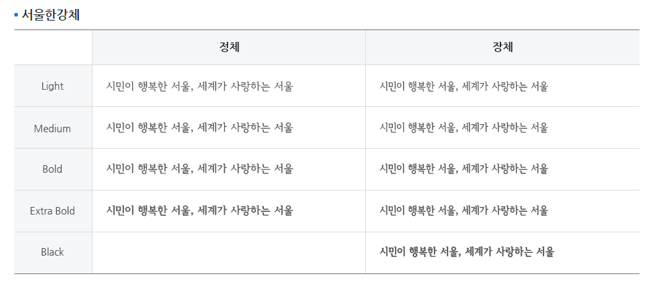 서울시청 에서 제공하는 상업용 무료폰트 서울서체 입니다. 서울서체는 서울한강체 4종, 서울남산체 4종, 서울한강 장체 5종, 서울남산 장체 5종으로 구성되어 있는데요, 두께로 4종 5종이 구분되어 있습니다. 명조체를 귀엽게 한옥스타일로 만들었다는 서울한강체 이미지 입니다. 다른 상업용 무료폰트와 마찬가지로 서울시 에서 무료로 제공하는 상업용 무료폰트 입니다. 서울서체는 아래 링크에 들어가셔서 다운 받으시면 되겠습니다.