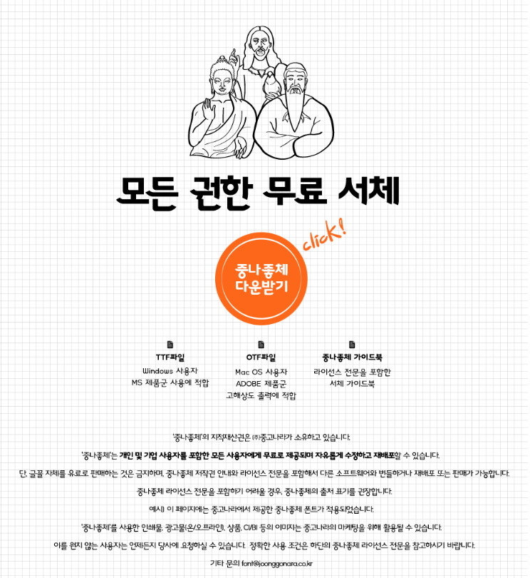 처음에 하나로만 해도 해낼수 있을거 같았는데 양이 너무 많아서 1탄 2탄으로 구분하려고 제목을 급 상업용 무료 폰트 모임 완벽해! 에서 상업용 무료 폰트 모임 1탄 완벽해! 로 급수정하였습니다. 포스팅 하나 하는데 시간이 많이 걸리긴 하네요. 하지만 많은 분들께서 부담스러운 폰트가격으로 고민하지 않고 사용하시도록 다 올려내겠습니다! 물론 윤고딕과 산돌폰트는 사용하기에 너무 매력적이긴 하지만요..! 나중에 벌어서 쓰죠!! 참! 폰트를 그냥 사용하는데에만 그치는게 좋을거 같아요. 폰트를 수정해서 다시 쓴다거나 등은 상업용 무료폰트 라고 해도 제재대상이 된다고 하니까요.