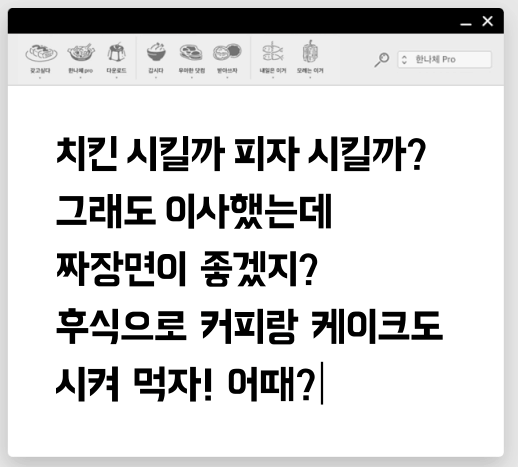 배달의민족 한나체 Pro로 타이핑을 하면, 어떤 글씨체들은 음식그림이 잠시 나타나곤 하는데요. 배달의민족에 등록된 음식점들을 위해, 배고픈 느낌, 식욕을 당기는 친근한 느낌이 강점이죠. 두번째는 한나체 Air 입니다. 한나는열한살체 인기에 힘입어 나온 매력적인 폰트 입니다. 본문 작성에 적합하다고 하네요. 세번째 기랑해랑체는 삐뚤빼뚤한 글씨체가 매력인 글씨체 입니다. 잘보시면 ㅁ,ㅇ의 속안이 작게 표현되어 있어요. 배달의민족의 시그니처 같은 폰트(?) 제 취향은 한나체Pro, Air, 그리고 도현체 입니다.