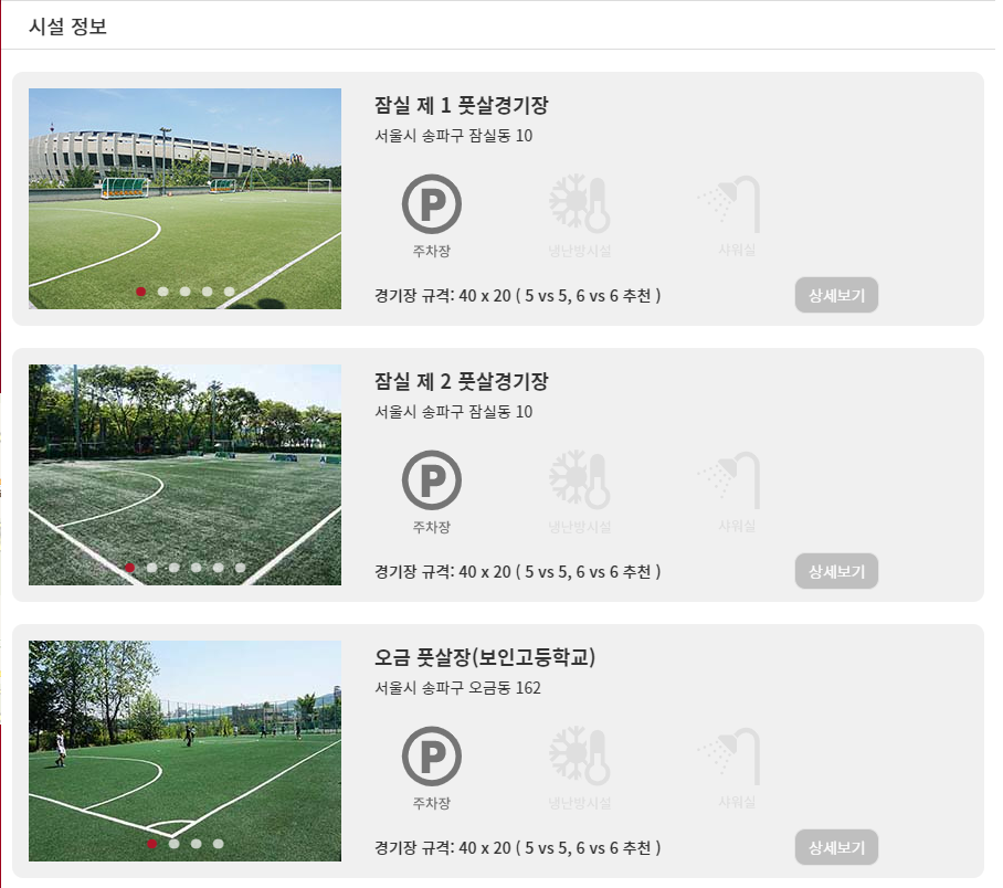 이어서 나오는 화면에 송파 라고 입력하면 가능한 시설들이 많이 나옵니다. 송파 지역에서 가장 인기 있는 축구장은 천마풋살장 입니다. 천마풋살장은 야외 A B C 이렇게 3곳과 함께 최근에는 실내도 만들어 오픈했다고 하네요. 천마풋살장 인기가 계속 많은 이유는, 일단 구장이 큽니다. 5:5풋살장이 넓고 재미있어서 인기가 가장 많은데요. 송파 지역의 천마풋살장 크기는 5:5이고 재미있게 할 수 있는 조건이 부합합니다.