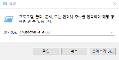 위의 사진과 같이 < 실행 >에 접속하신 다음에 명령어를 입력하겠습니다. 입력하실 컴퓨터 끄기 예약 명령어는 shutdown -s -t 60 인데요. 이것이 의미하는 바는, 60초뒤에 전원을 자동종료 하겠다는 것입니다. 60은 60초.