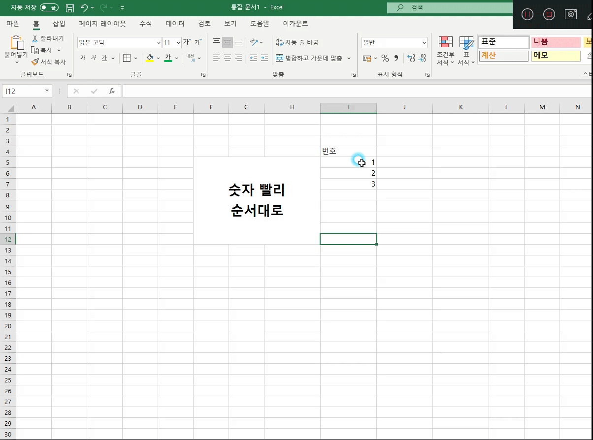 아니오 순서대로 쓰는거면 일일이 다 쓸필요가 없습니다. 마우스로 아래와 같이 123을 왼쪽십자가가 보이게 온마우스 하시고 그대로 왼쪽마우스 끌고 쭈우욱 내려오면 순서대로 쭉내려오게 됩니다. 숫자 빨리 순서대로 아주 쉽지요.
