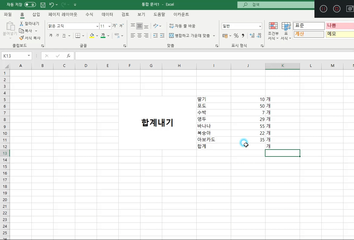 사실 회사에서 경리보거나, 수식이 많이 들어가는 걸 하지 않는다면, 크게 어려운 계산식은 필요없습니다. 간단하게 합계를 쉽게 내는 함수와, = 이거면 들어가면 우리가 학교다니면서 배운 수학공식을 넣기만 하면 됩니다. 합계는 =sum(행열시작:행열끝) 이렇게 하시면 원하는 합계값을 구하실 수 있습니다.