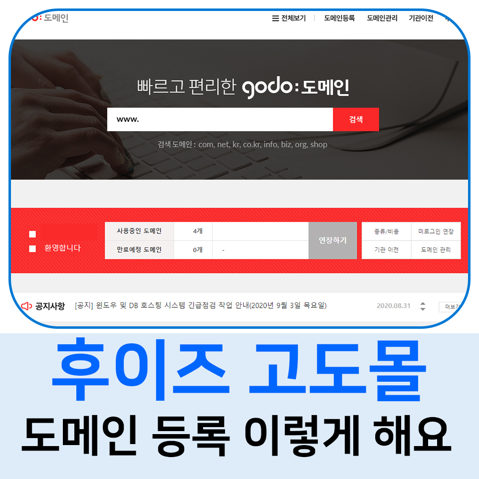 후이즈 고도몰 도메인 등록 하다가 도메인 등록하고 사고 모르시는 분 있을까봐 이렇게 올려 봅니다. 사실 온라인에 여러 도메인을 등록할 수 있는 업체들이 많은데요, 그중에서 제가 생각할때에 어떤어떤 편리성을 제공한 두업체를 포스팅 합니다.