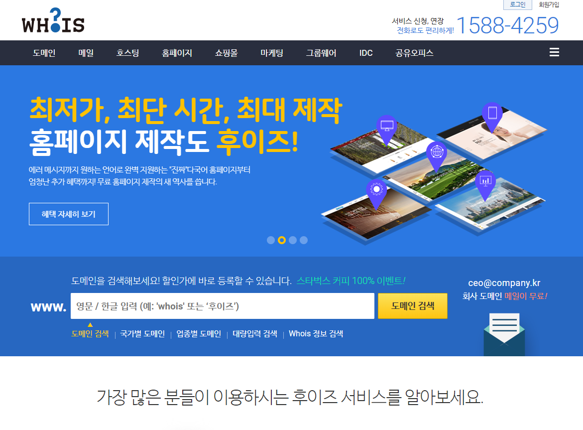 일단 후이즈는 제가 생각할때, 인터넷 쇼핑몰을 하는 사람이라면 필요한 2가지중, 도메인에 가장 강점을 두고 있는 회사같아 보였습니다. 왜냐면, 다른 업체들은, 클릭을 한번씩은 하고 이동해야 하는데, 후이즈의 경우, 홈페이지 들어가자마자, 도메인을 칠 수 있기 때문입니다. 별거 아닌건대, 사실 웹디자이너 분들이나, 웹에이젼시 분들에게 있어, 도움이 될 수 있을거 같네요. 물론 대부분 제가 알기로는 카페24를 더 중용한다고는 알고 있습니다. 개발과 코딩에 대한 자유로움 그리고 그안에서 연계성 때문일텐데요. 저처럼 혼자 하시는 분들에게는 좀 유용하다고 볼 수 있겠습니다.