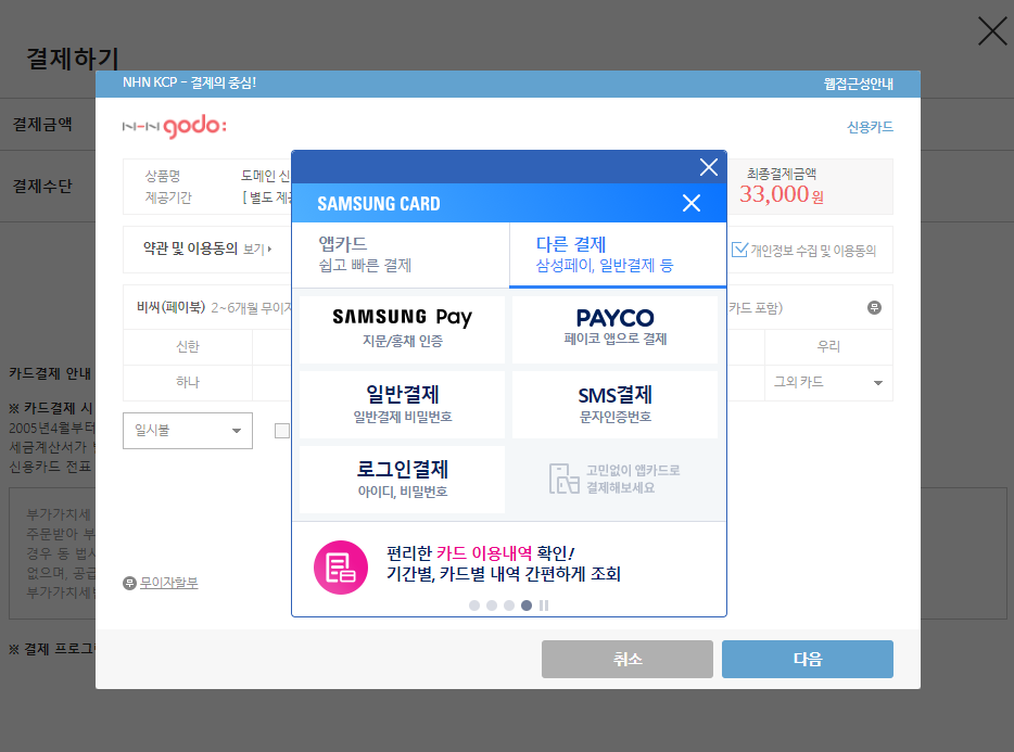 여기까지 다 하셨다면, 그다음은, 결제 입니다. 저는 갤럭시폰이용자로 삼성페이가 매우 편리해서 삼성페이로 합니다. 참, 폰을 재부팅하셨다면, 신호를 받는데 시간이 걸리는 경우도 있습니다.