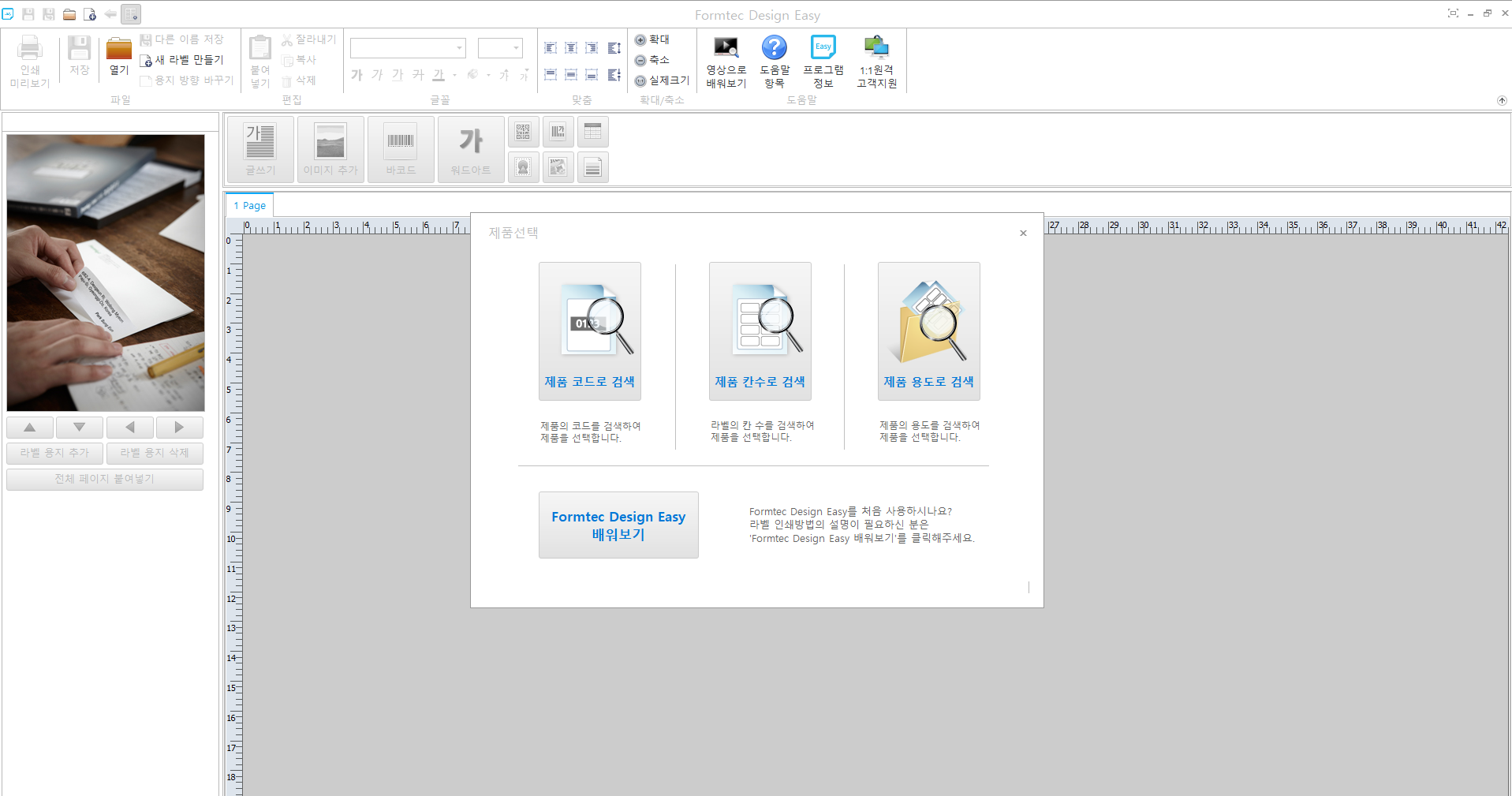설치를 끝내고 실행을 하면, 아래와 같이 나오는데요,(잘 사용됩니다) Formtec Design Easy 배워보기 라고 있지만, 우리는 시간이 급하죠. 생략하고 제품코드로 검색을 실행하겠습니다. 제품코드는 우리가 구매한 스티커 용지에 써 있습니다. 이전의 디자인프로9과 구분된다고 생각드는게, 제품 칸수로 검색이 있는데요, 일단 편의상 제품코드로 검색을 사용하겠습니다. 제가 검색할 제품코드는 3510 이라는 코드로 직사각 모양의 10칸 짜리 스티커 용지 입니다.
