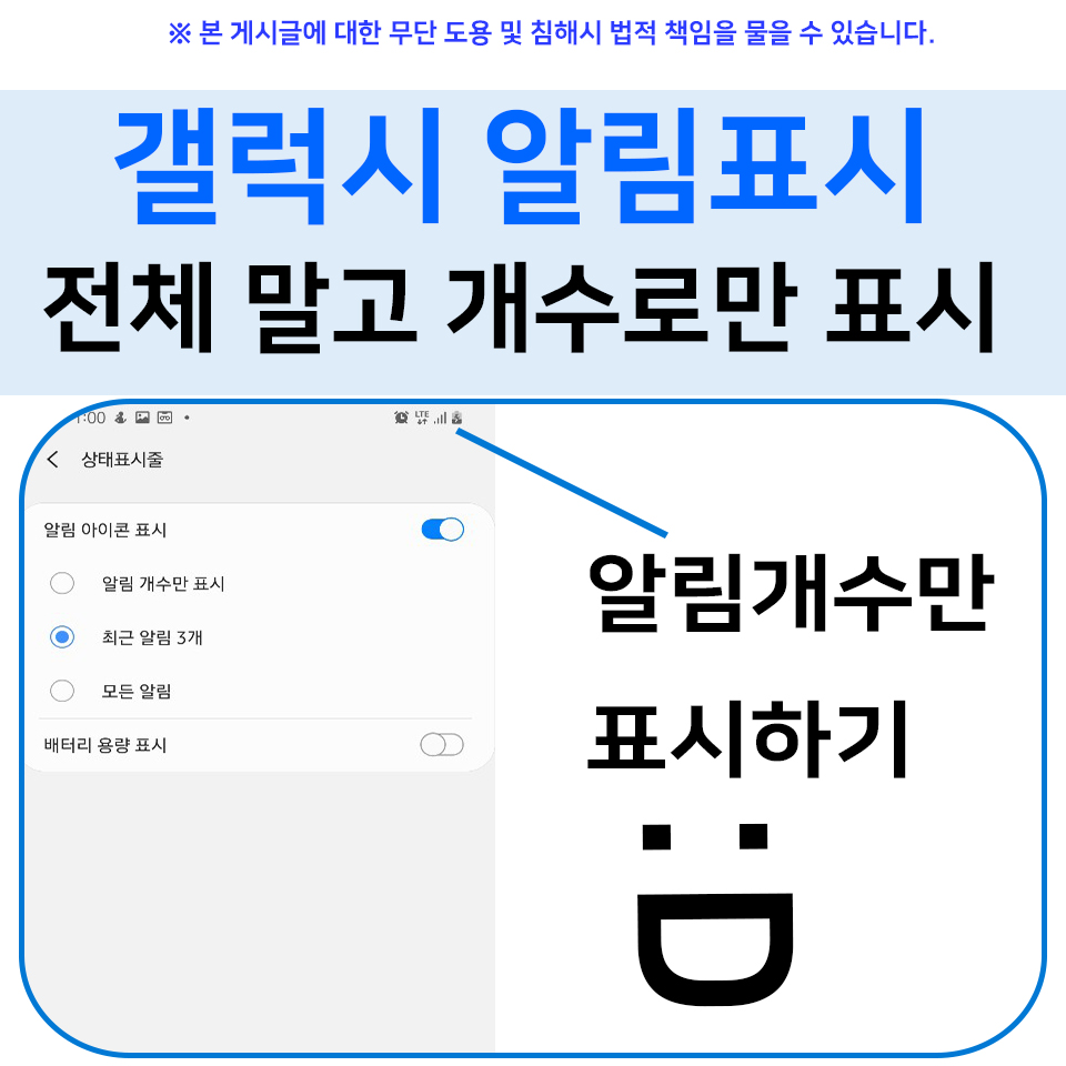 좀 더 편리하고 깨끗하고 정리된 스마트폰 사용을 할 수 는 없을까? 갤럭시 스마트폰 상단에 정리가 안된 마구잡이의 알람이 어느순간 매우 불편하게 느껴지는 순간(?)이 다들 한번씩은 있지 않았을까 생각해 봅니다. 불편함과 컴플레인 등이 있었기에, 삼성 에서 발빠르게 기능업데이트를 한건 아닐까 라는 추측을 해보았는데요, 아무튼, 이 기능 생각보다 쓸만합니다. 스마트폰 사용에 있어, 내가 스마트폰을 보고 있을때, 가득찬 사람들 속의 지하철이든, 친구들과 모여 수다를 떨때 나란히 앉은 친구가 내 대화는 물론 알림을 보고 어떤 알림이 왔나 유추를 하는 건 정말 어떤 때는 불편한 순간들 인데요. 그래서 오늘 포스팅 해보고자 합니다. 갤럭시 알림표시 전체 말고 개수로만 표시 입니다.