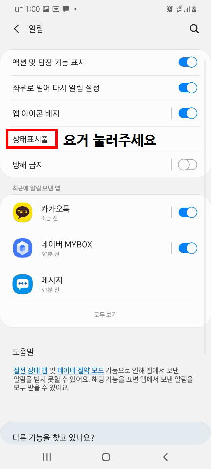 STEP3. 알림 카테고리에 들어오셨다면, 상태표시줄 이라고 적혀 있는걸 눌러주세요.