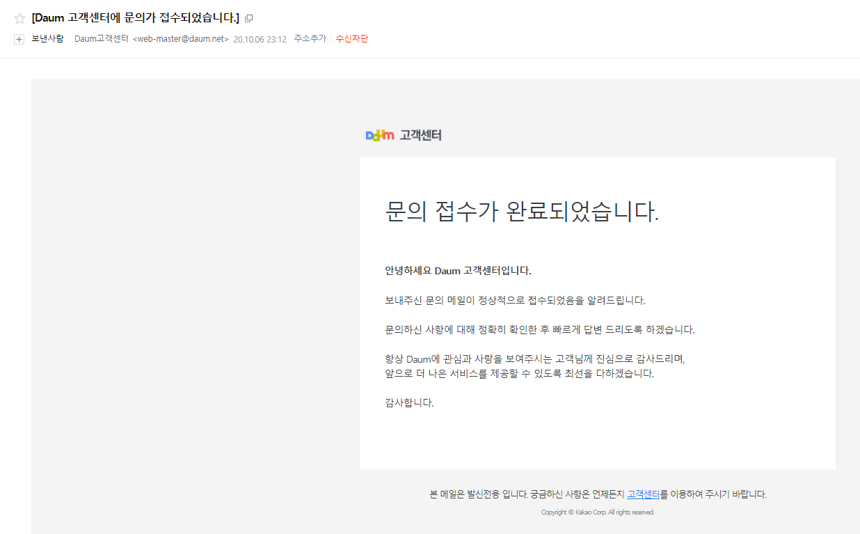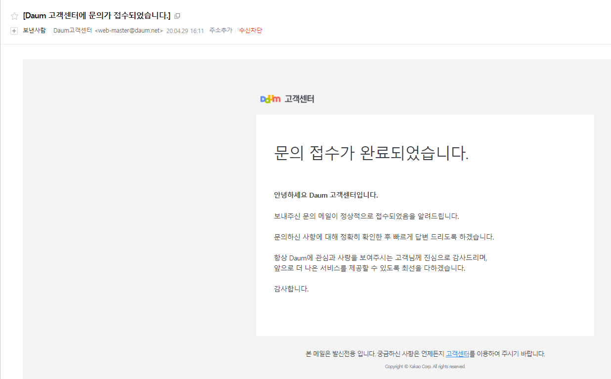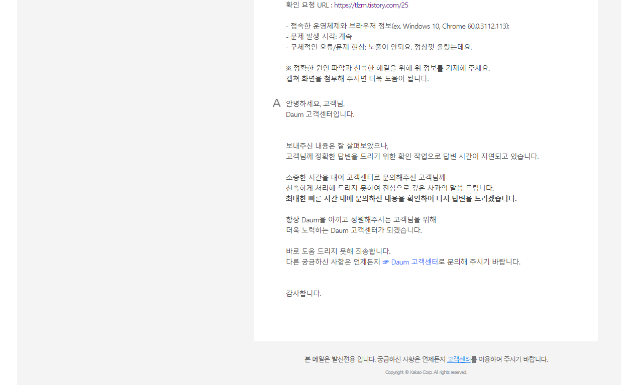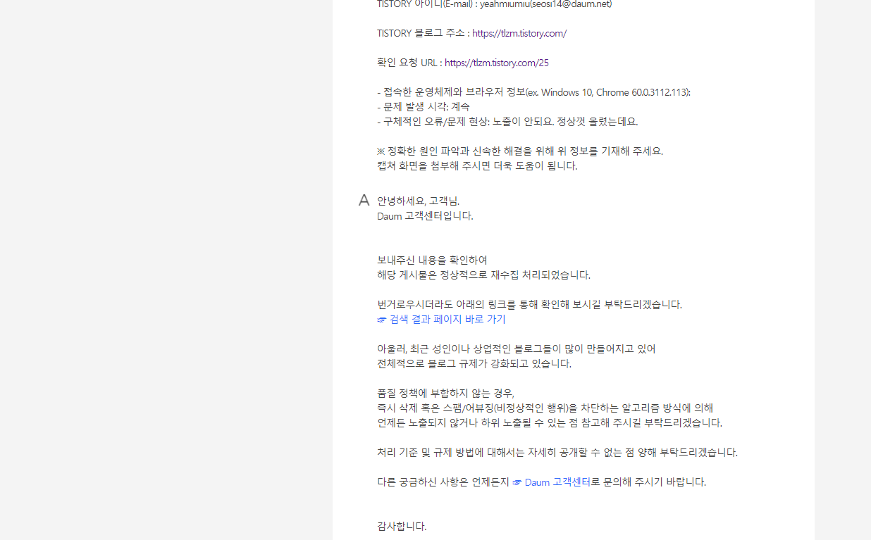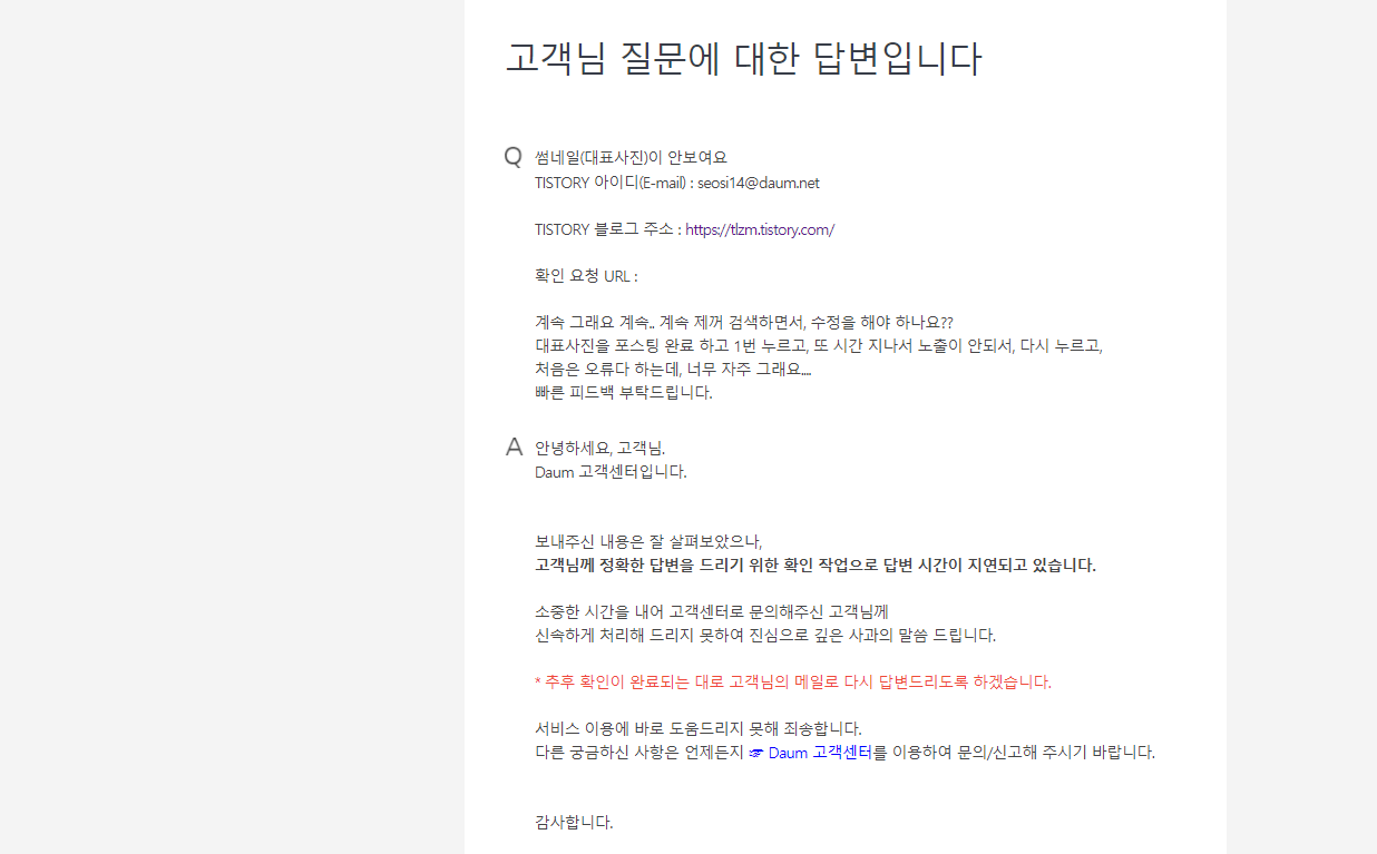 4. 티스토리 썸네일 노출을 위해 Daum 고객센터에 요청한 내용과 결과.