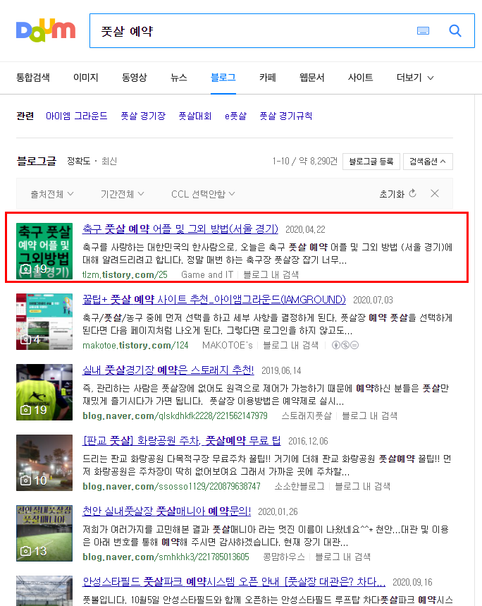 제가 저희 조기축구팀 총무로서, 다른 축구 풋살 예약 하시는 분들도, 도움되시기를 바라며, 정말 나름 최선을 다해 올린 포스팅 입니다.(다들 그렇게 하셨듯이 저도 그랬답니다:D) 이거는 다행히 다음 토탈사이트 에서 검색하였을때도, 썸네일이 보입니다.(사실은 Daum Kakao 고객센터에 요청해서 재수집된 포스팅입니다)