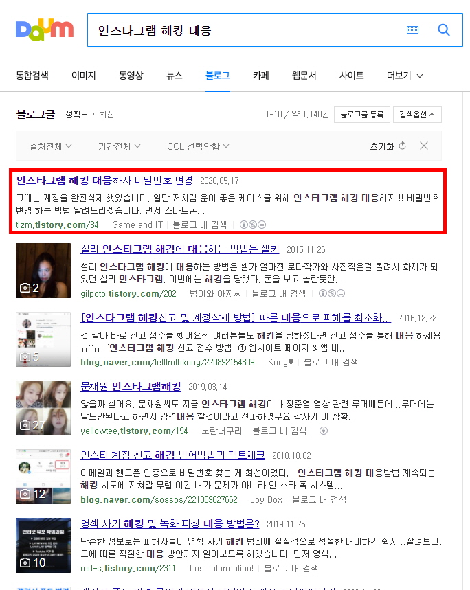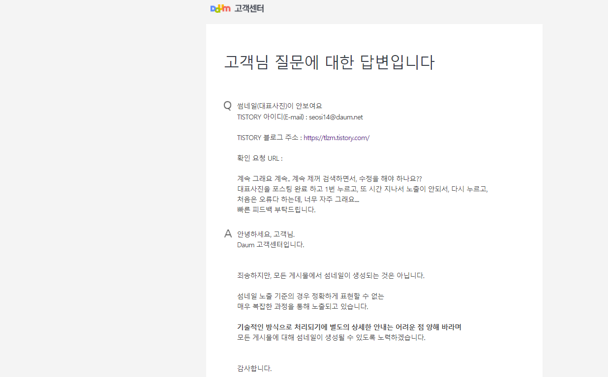 : 한 포스팅이 검색했을때 티스토리 썸네일이 보이지 않아 Daum고객센터에 문의접수하였습니다.
