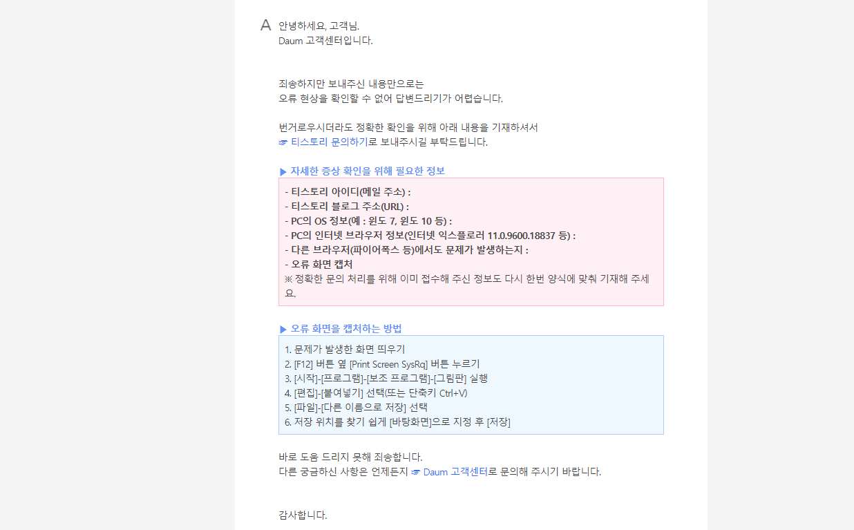 : 자세한 증상 확인을 위해 필요한 정보와 오류화면을 캡쳐하는 방법에 대해 알려주네요. 제가 보내드린 내용이 부족했기 때문으로 생각합니다.