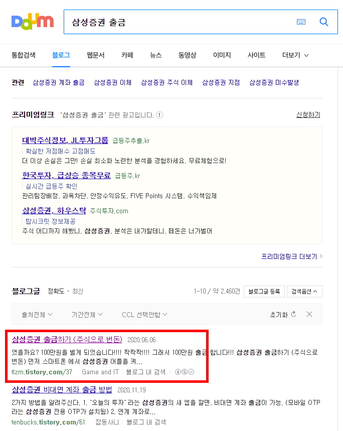 제가 올린 < 삼성증권 출금 > 제목의 티스토리 입니다. 프리미엄링크를 제외하고 블로그글에서는 2020.06.06날 올린것으로 가장 위에 있어 기쁘기는 한데, 썸네일이 없으니, 좀 뭔가 아쉽네요. 바로 아래는 해당포스팅 내용입니다.