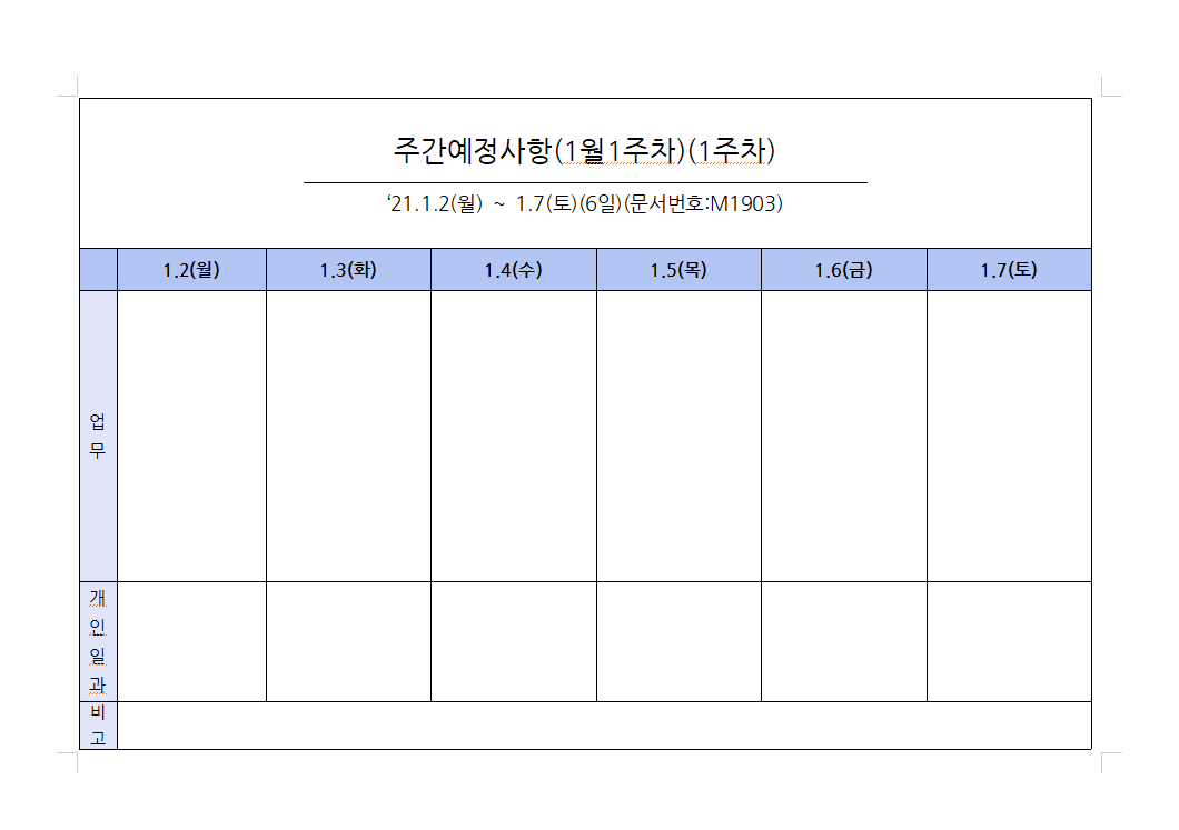 오늘은 앞서 올려드린 2021년도 월별 달력 A4사이즈, 책상부착용에 이어, 자영업자와 회사등에 꼭 필요한 주간예정사항 문서서식 (hwp,pdf) 업무서식 파일을 무료다운 으로 올려드립니다. 저는 아주 유용하게 사용하고 있는 서식으로 활용도가 아주 좋습니다. 비밀번호 안걸려 있습니다.