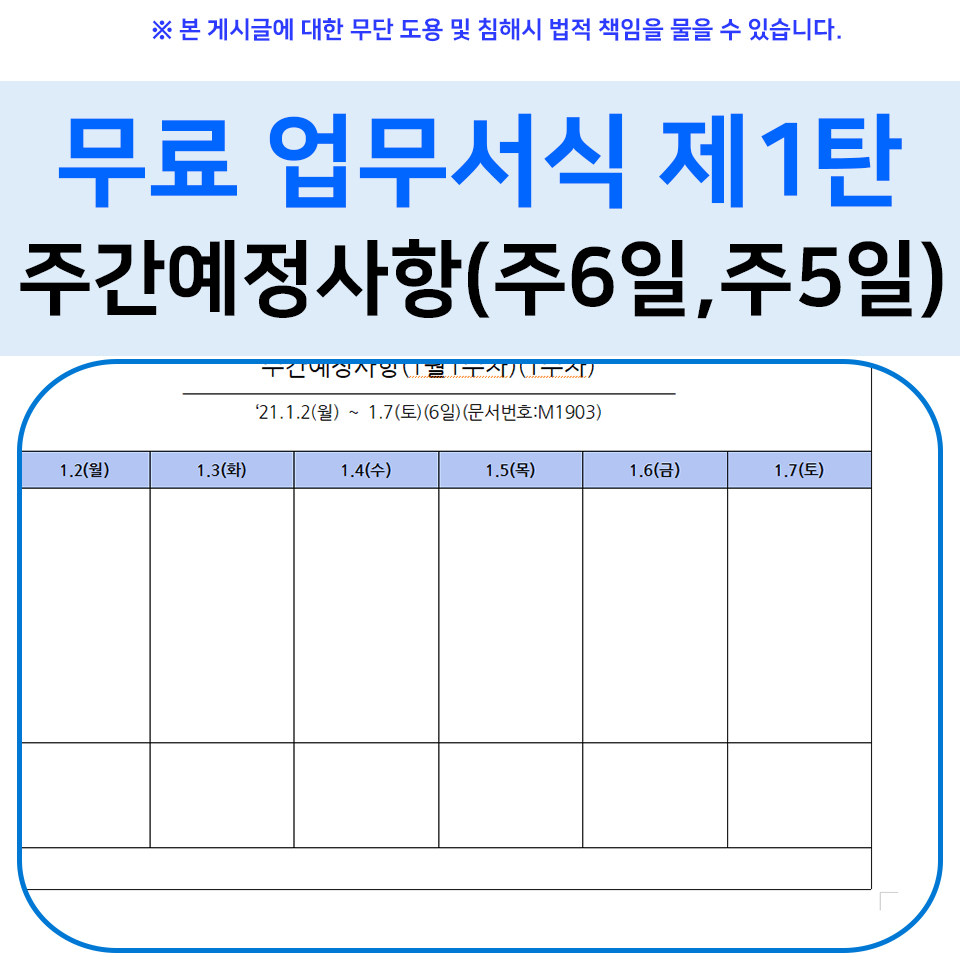 무료 업무서식 제1탄 주간예정사항 주6일 주5일 올려드렸는데요, 앞으로도 꾸준히 업무와 연계하거나 그외 올릴수 있는 무료서식 대해 만들어서 올리겠습니다. 아무쪼록 도움되시길 바랍니다. 제가 올려드려 공유하는 무료서식 한글파일(전체)와 엑셀(일부)는 요청주시면 무료로 만들어드리니 요청주세요. 감사합니다.