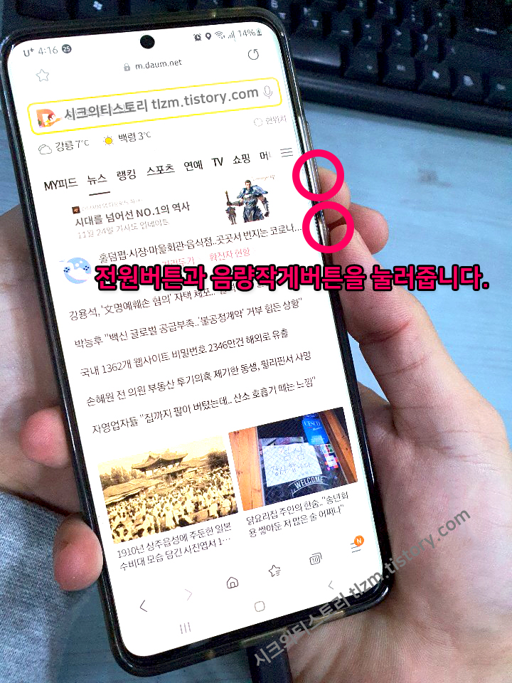 2번째방법은 바로 버튼을 꾹 눌러서 캡처하는 방법입니다. 대략3초정도 눌러주시면 됩니다. 아래 사진과 같이 전원버튼과 음량작게하는 버튼을 동시에 꾹 눌러주면, 폰테두리가 하얗게 쳐지면서, 캡처가 되는 것을 확인하실수 있습니다.