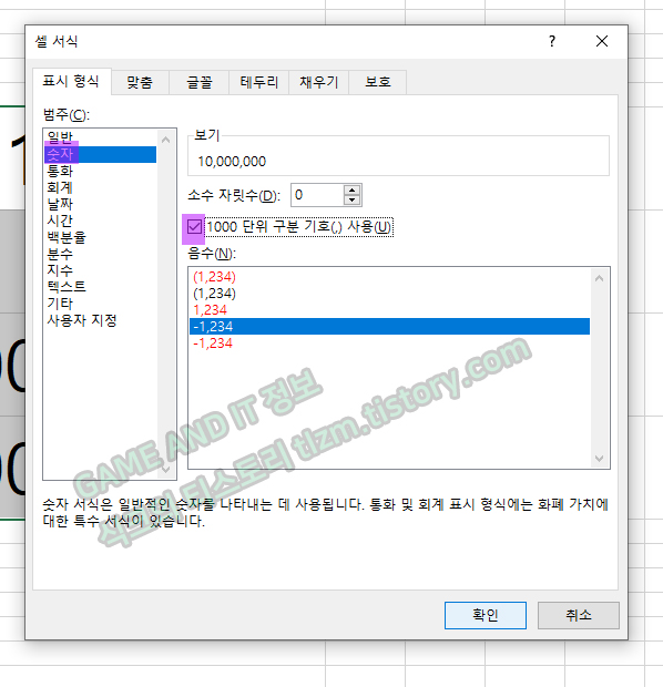 STEP2. 좌측의 범주(C)에서 숫자> 오른쪽에 1000단위 구분 기호(,) 사용을 클릭하시면 됩니다. 이때 숫자에 콤마를 표시할때에, 밑에 괄호, 빨간글씨, 마이너스 등을 골라서 표시해주시면 됩니다. 저는 아래 이미지와 같이 4번째 -1,234를 클릭해주었습니다. 그냥 검정색입니다.