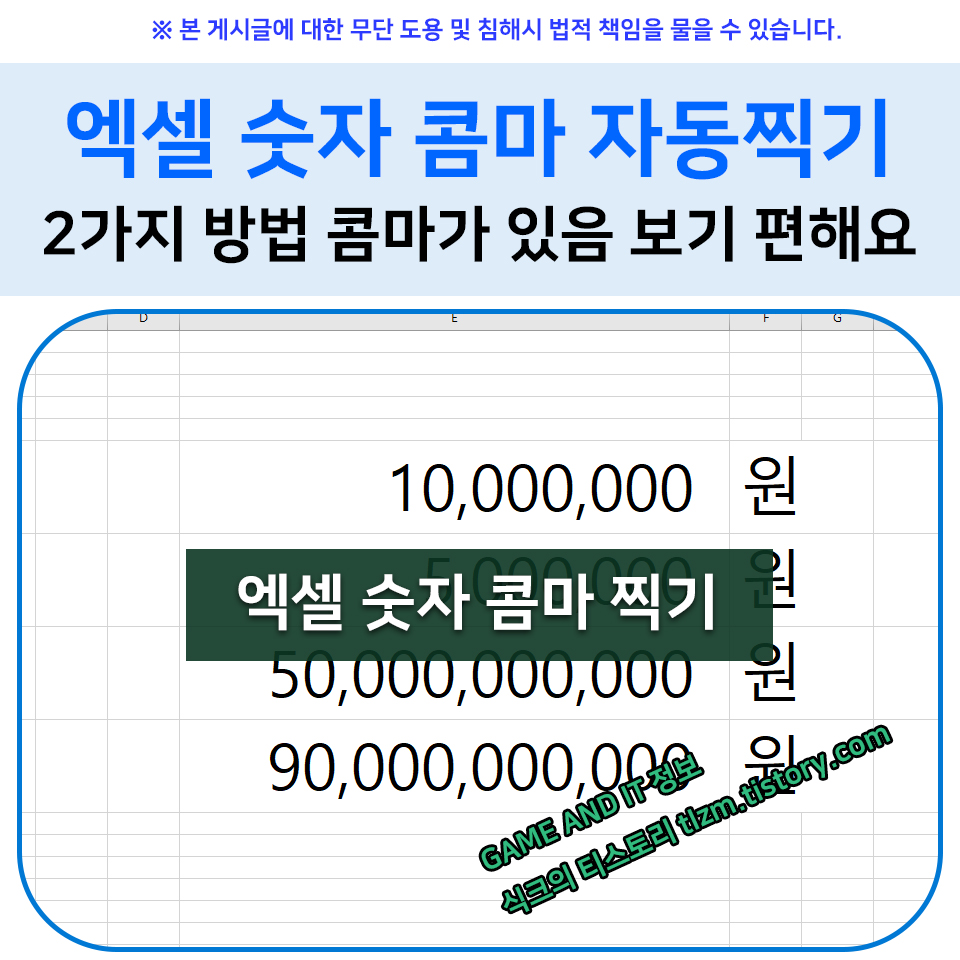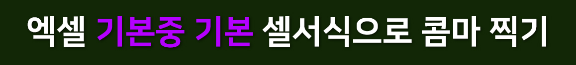 사실 첫번째 방법이 쉽기는 쉽지만, 엑셀을 능숙히 다루고자 하신다면, 엑셀 기본중 기본인 셀서식을 자주 활용하시라는 말씀을 드리고 싶습니다. 왜냐면 셀서식을 자주 쓰시다보면, 셀서식 기능에 대해서 사용자 본인도 모르게 익히게 되는 경우가 있거든요,그럼 셀서식으로 숫자에 콤마 찍는 방법 알려드릴게요!